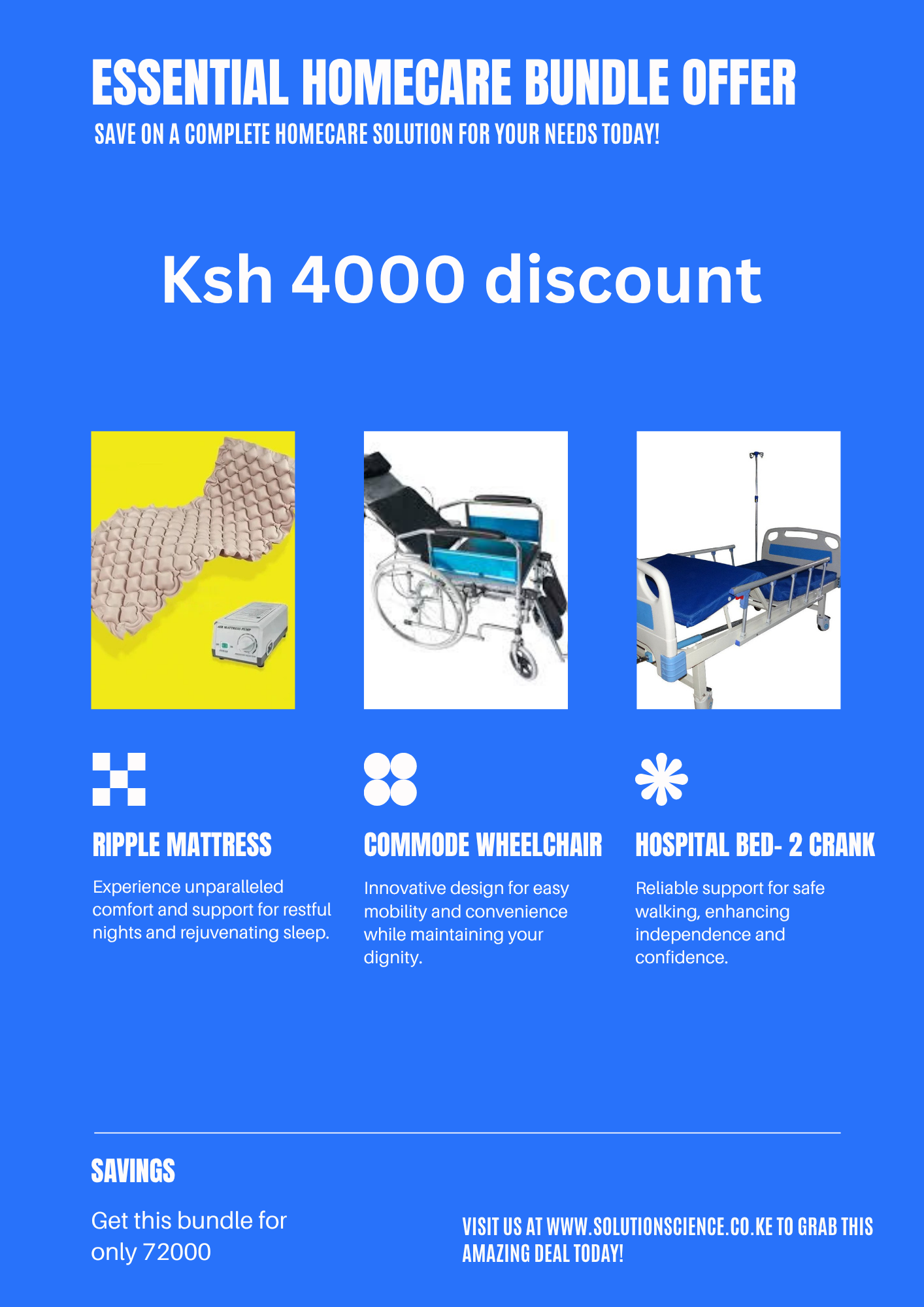 Upgrade your home setup with our Home Comfort & Mobility Essentials bundle. This thoughtfully curated collection includes three essential items that work together to create a more comfortable living environment: an ripple mattress for superior rest, an reclining wheelchair for convenient mobility, and a hospital-style bed with adjustable positioning. Perfect for families looking to enhance their home with quality furniture and mobility solutions. One bundle, complete convenience, and excellent savings. Order today and experience the difference quality comfort products can make.